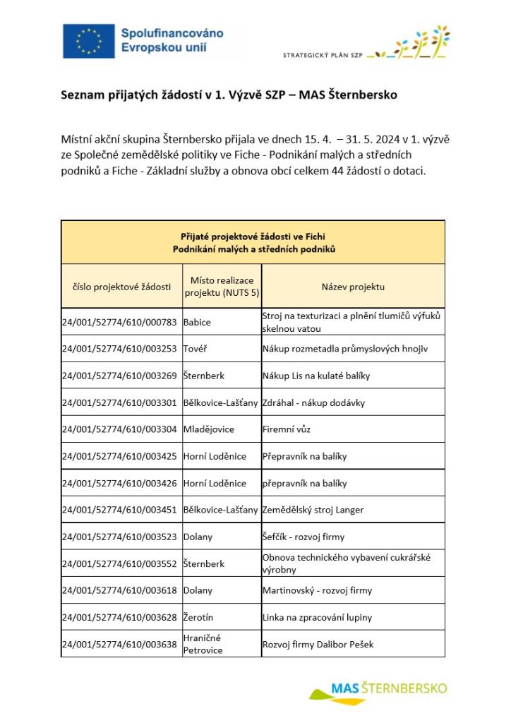 Místní akční skupina Šternbersko přijala ve dnech 15. 4. – 31. 5. 2024 v 1. výzvě ze Společné zemědělské politiky ve Fiche - Podnikání malých a středních podniků a Fiche - Základní služby a obnova obcí celkem 44 žádostí o dotaci.