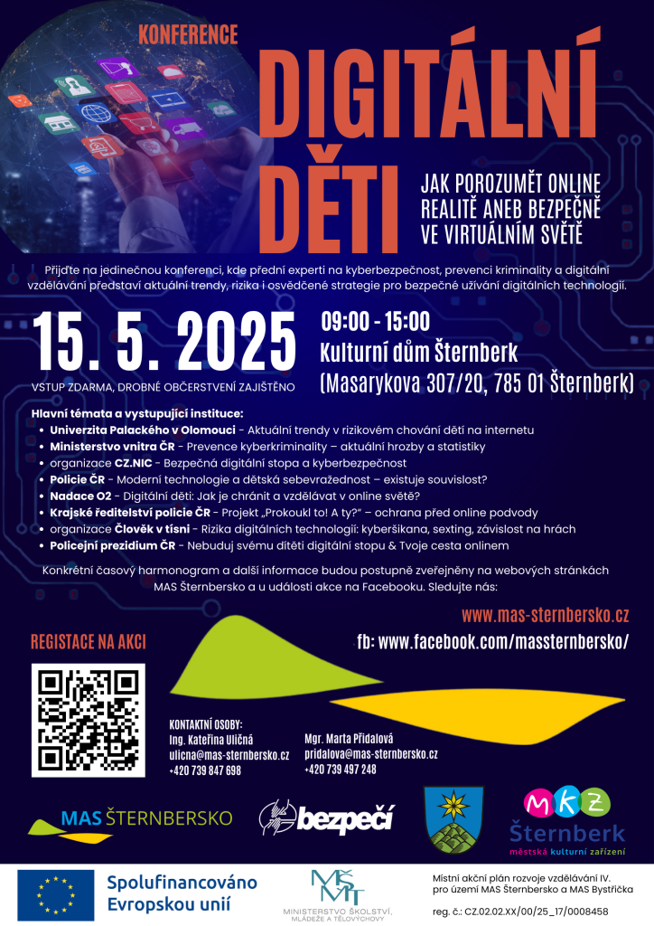 Digitální svět se stává nedílnou součástí života dětí a mládeže. Jaké nástrahy a výzvy jim přináší? Jak mohou rodiče, pedagogové i odborníci pomoci dětem bezpečně se orientovat v online realitě? Přijďte na jedinečnou konferenci, kde přední experti na kyberbezpečnost, prevenci kriminality a digitální vzdělávání představí aktuální trendy, rizika i osvědčené strategie pro bezpečné užívání digitálních technologií. Zabývat se budeme tématy, které se týkají nejen dětí ale i dospělých.