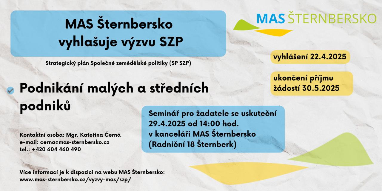 Dne 22.4.2025 vyhlašujeme 2. výzvu MAS Šternbersko SZP zaměřenou na rozvoj podnikání. Příjem žádostí probíhá do 30.5.2025. Celková alokace výzvy je 2.143.650,-Kč.